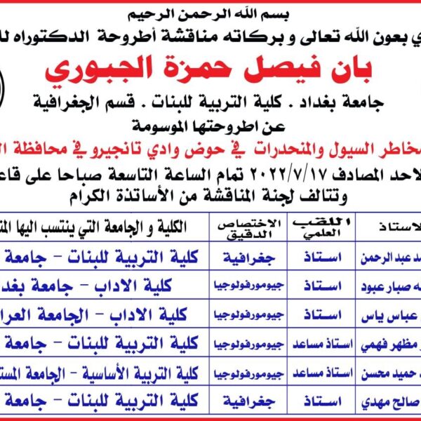 جرت -بعون الله تعالى – المناقشة العلنية لطالبة الدكتوراه : (بان فيصل حمزة ) من قسم الجغرافية عن رسالتها الموسومة : ( نمذجة مخاطر السيول والمنحدرات في حوض وادي تانجيرو في محافظة السليمانية) في يوم الاحد الموافق 17/7/2022 في قاعة المناقشات في رحاب كلية التربية للبنات / جامعة بغداد .
