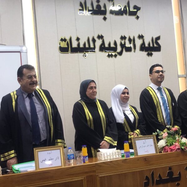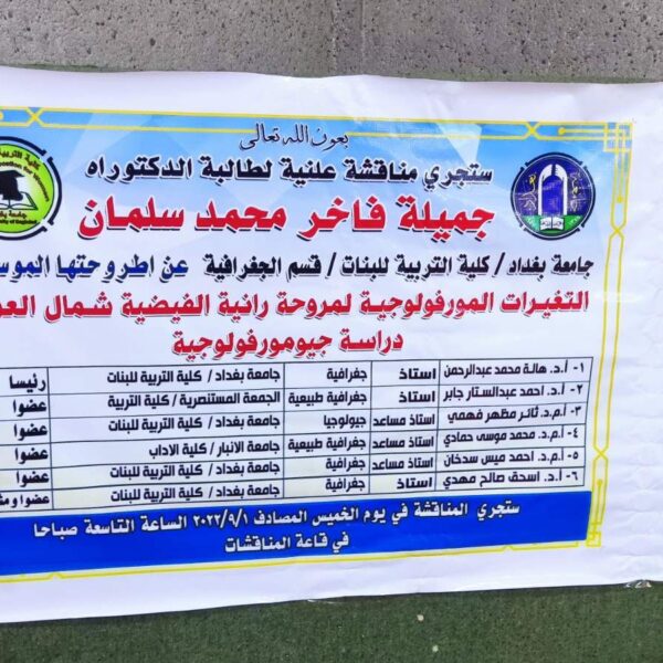 جرت – بعون الله تعالى – المناقشة العلنية لطالبة الدكتوراه ( جميلة فاخر محمد سلمان ) من قسم الجغرافية عن اطروحتها الموسومة : (التغيرات المورفولوجية لمروحة رانية الفيضية شمال العراق /دراسة جيومورفولوجية ) في يوم الخميس الموافق 1/9/2022 على قاعة المناقشات في رحاب كلية التربية للبنات / جامعة بغداد .