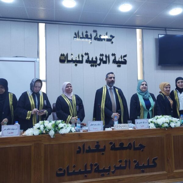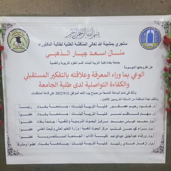 جرت – بعون الله تعالى – المناقشة العلنية لطالبة الدكتوراه (منال اسعد جبار) من قسم العلوم التربوية والنفسية عن اطروحتها الموسومة بــــ (الوعي بما وراء المعرفة وعلاقته بالتفكير المستقبلي والكفاءة التواصلية لدى طلبة الجامعة) في يوم الاحد 11/ 9/ 2022 في تمام الساعة التاسعة صباحاً في قاعة المناقشات في رحاب كلية التربية للبنات .