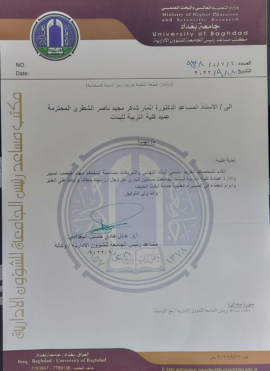 لرئاسة جامعة بغداد الموقرة متمثلة بالسيد رئيس جامعة بغداد الدكتور منير السعدي المحترم والسيدين المساعد العلمي الدكتور مروان حميد عاشور والمساعد الاداري الدكتور عادل هادي البغدادي المحترمين للثقة التي منحوها لنا بتكليفنا عميدا لكلية التربية للبنات في جامعة بغداد. ندعو الله ان يوفقنا في اداء هذه المهمة خدمة للعلم والتربية والتعليم