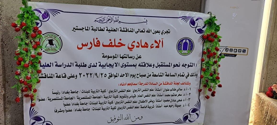 تمت -بعون الله تعالى – مناقشة طالبة الماجستير ( الاء هادي خلف ) قسم قسم العلوم التربوية والنفسية /جامعة بغداد كلية التربية للبنات عن رسالتها الموسومة : ( التوجه نحو المستقبل وعلاقته بمستوى الأيجابية لدى طلبة الدراسات العليا ) يوم الاحد الموافق 25 / 9 / 2022 في قاعة المناقشات في رحاب كلية التربية للبنات .