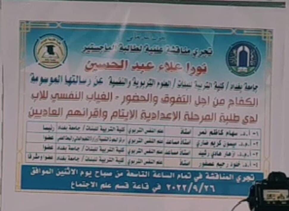 تم بعون الله تعالى المناقشة العلنية لطالبة الماجستير (نورا علاء عبد الحسين ) من قسم العلوم التربوية والنفسية عن رسالتها : ( الكفاح من اجل التفوق والحضور _ الغياب النفسي للاب لدى طلبة المرحلة الاعدادية الايتام واقرانهم العاديين ) في يوم الاثنين 26/9/2022 التاسعة صباحاً في قاعة المناقشات في رحاب كلية التربية للبنات.