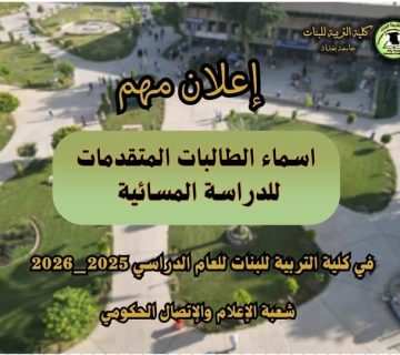 تم تغيير موعد حفل تخرج طالبات المرحلة الرابعة للعام الدراسي 2015-2016 (دورة 59) الساعة الثانية ظهراً من يوم الأحد الموافق 4/12/2016 والذي سيتم برعاية السيد معالي وزير التعليم العالي والبحث العلمي أ.د.عبد الرزاق العيسى على ملاعب كلية التربية البدنية وعلوم الرياضة. علماً أنه سيسمح بدخول الطالبات الخريجات ممن يحملن باج الكلية فقط والذي يمكن استلامه من أقسامهن حتى نهاية الدوام الرسمي ليوم الخميس 1/12/2016. كما يرجى تواجد الطالبات قبل ساعة من بدء الحفل.
