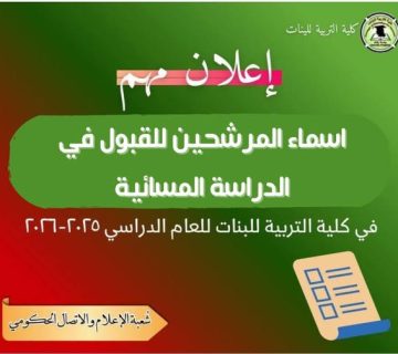 انسجامًا مع خططها التطويرية والخدمية، وحرصًا على تهيئة بيئة جامعية مريحة وآمنة، وجهت عميدة كلية التربية للبنات الأستاذة الدكتورة اثمار شاكر مجيد الشطري المحترمة، اللجنة المعنية بأعمال التأهيل، للبدء بتجديد النادي الترفيهي الخاص بالطالبات ليكون فضاءً عصريًا يجمع بين الراحة والنشاط التفاعلي.
