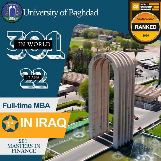 أعلنت جامعة بغداد دخول كلية الإدارة والاقتصاد والمعهد العالي للدراسات المحاسبية والمالية ضمن تصنيف QS Global MBA Rankings 2026، إذ حققا المرتبة 301+ عالميًا من أصل 389 جامعة مشاركة، والمرتبة 22 على مستوى الشرق الأوسط في برامج ماجستير إدارة الأعمال (MBA)، وذلك لأول مرة في تاريخهما الأكاديمي .