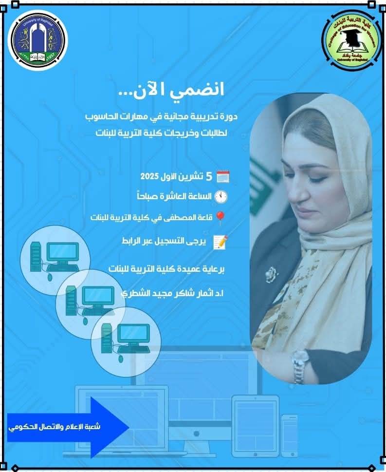 أعلنت عميدة كلية التربية للبنات ومديرة مركز دراسات المرأة في جامعة بغداد ا.د اثمار شاكر مجيد الشطري المحترمة ، عن فتح باب التسجيل في الدورات التدريبية لمهارات الحاسوب، وذلك ضمن أحد أهداف ملتقى المرأة لإدماجها في سوق العمل. وذلك بتنظيم رئيسة قسم الحاسوب ا.م ايمان محمد جعفر المحترمة، ونخبة من معيدات واستاذات القسم.