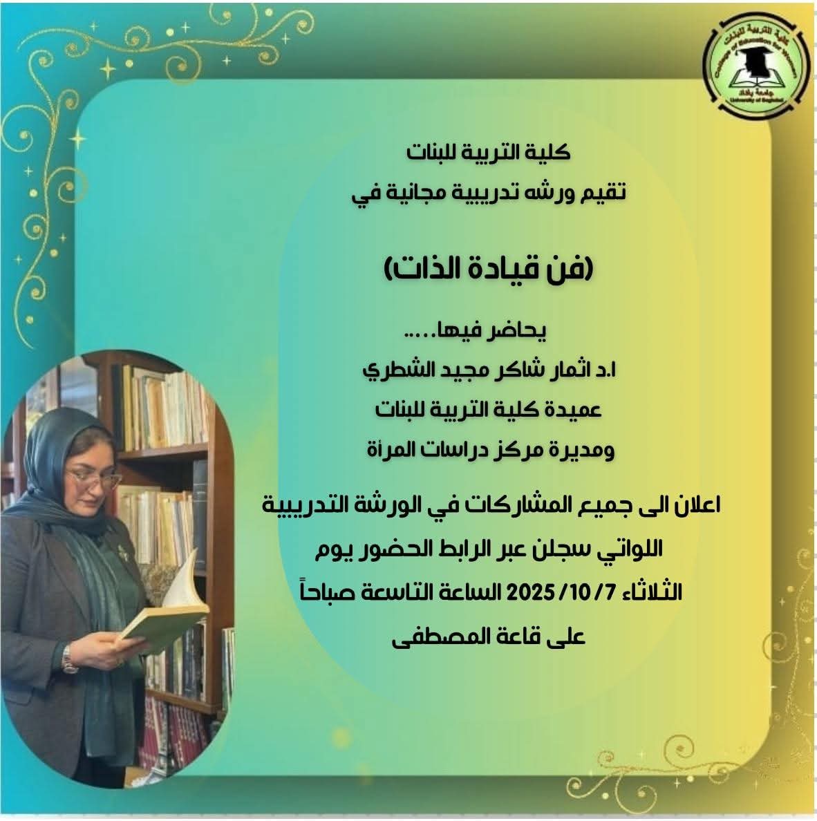 تدعوكم كلية التربية للبنات إلى حضور الورشة التدريبية المميزة الموسومةب: ((فن قيادة الذات))، التي تحاضر فيها السيدة عميدة كلية التربية للبنات و مديرة مركز دراسات المرأة الأستاذة الدكتورة اثمار شاكر مجيد الشطري المحترمة، في صباح يوم الثلاثاء الموافق ٧ تشرين الأول ٢٠٢٥وعلى قاعة المصطفى في رحاب كلية التربية للبنات