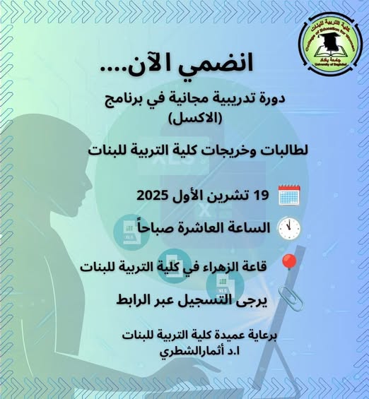 برعاية عميدة كلية التربية للبنات ومديرة مركز دراسات المرأة في جامعة بغداد الأستاذة الدكتورة إثمار شاكر مجيد الشطري المحترمة، أُعلن عن فتح باب التسجيل في الدورة التدريبية المجانية لمهارات الحاسوب في مجال Microsoft Excel 2016، وذلك ضمن أهداف ملتقى المرأة لإدماجها في سوق العمل.