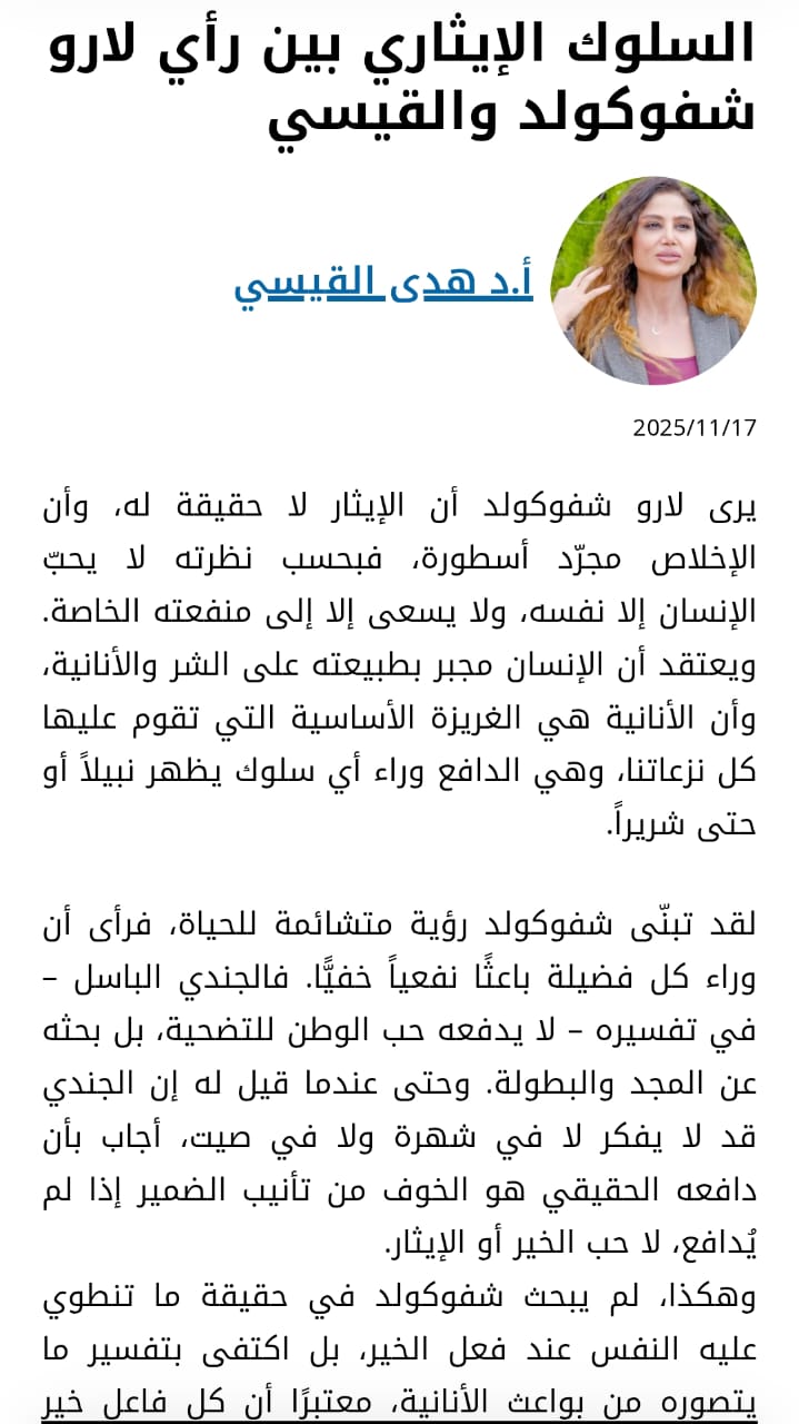 🔹تناولت القيسي في مقالها الجدل الفلسفي حول حقيقة الإيثار، مبينةً اعتراضها على رؤية لارو شفوكولد الذي عدَّ الإيثار وهمًا والدوافع الإنسانية قائمة على المنفعة الذاتية. وفي مقابل ذلك أكدت القيسي أن السلوك الإيثاري سلوك أصيل في الإنسان، مستشهدةً بتحليلات فرويد وتقسيماته للنفس، وبالنص القرآني الذي يحث على الإيثار.