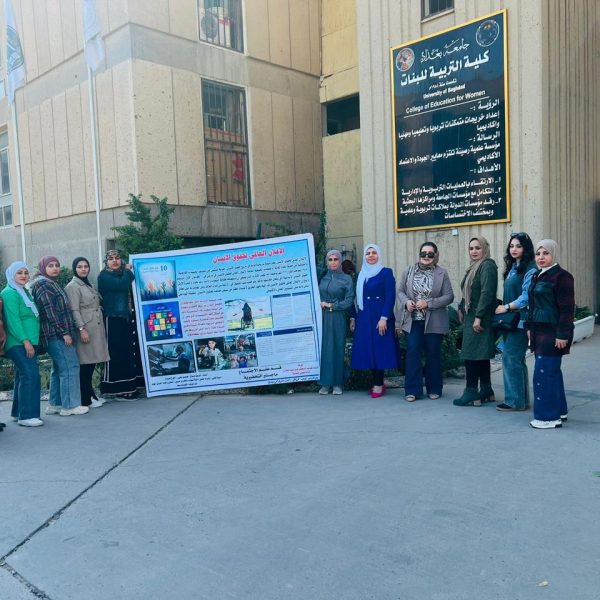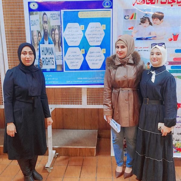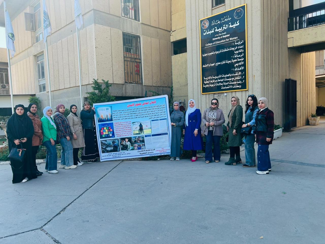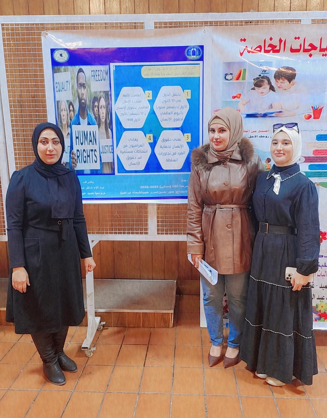 برعاية السيدة عميدة كلية التربية للبنات الأستاذة الدكتورة اثمار شاكر مجيد الشطري المحترمة، وبإشراف مسؤولة وحدة حقوق الإنسان م.د آلاء شاكر محمود، أفتتح قسم الاجتماع فعاليات الأسبوع العالمي لحقوق الإنسان يوم الاثنين الموافق ٨ كانون الأول ٢٠٢٥، وفي قاعة المصطفى بـ معرض توعوي لبوسترات متنوعة تناولت أهم مبادئ حقوق الإنسان وأنواعها وأهميتها في بناء مجتمع واعٍ ومسؤول.